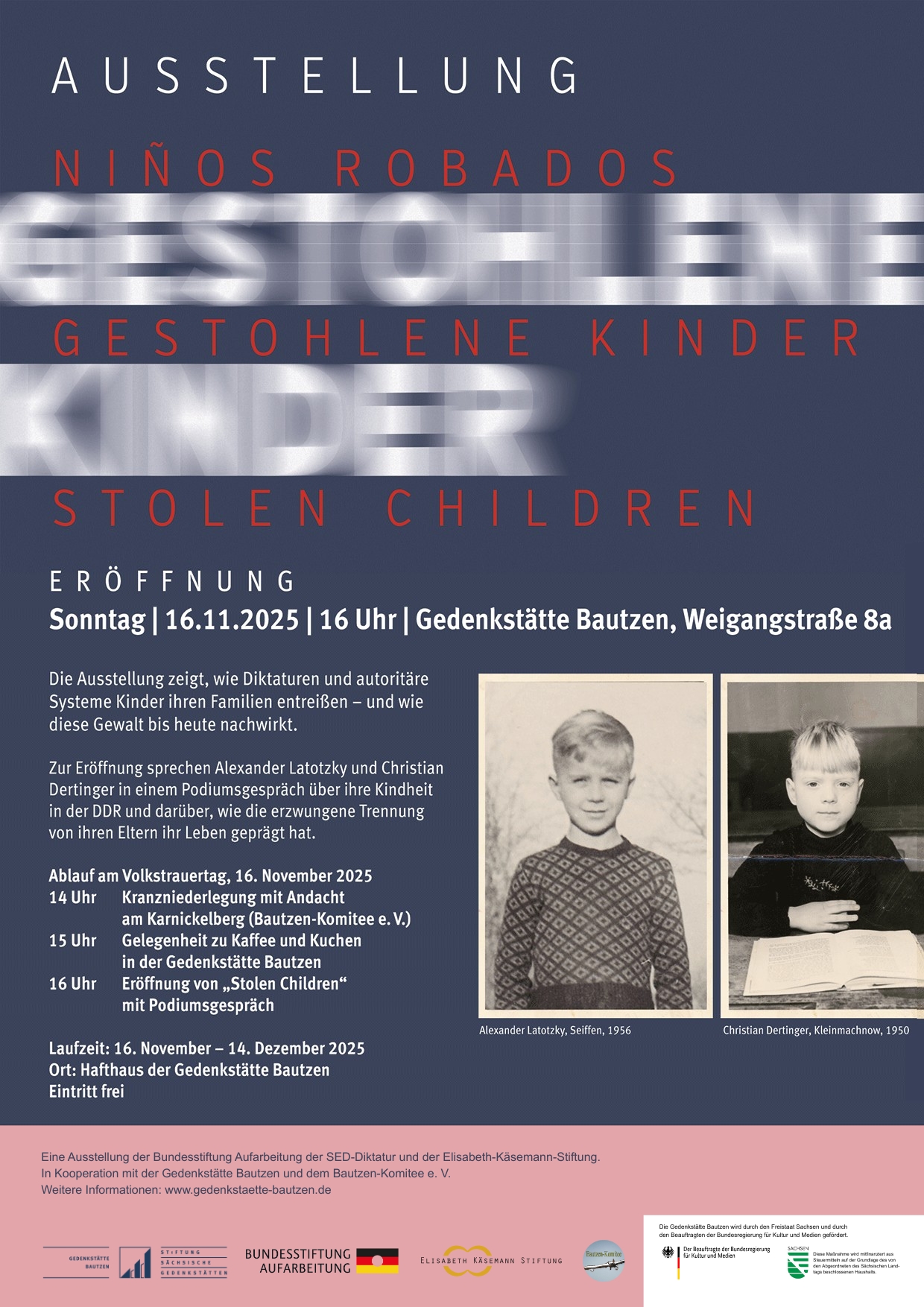 Am Sonntag, den 16. November 2025, eröffnet die Gedenkstätte Bautzen um 16 Uhr die Ausstellung „Niños robados. Gestohlene Kinder. Stolen children“. Zur Eröffnung berichten die Zeitzeugen Alexander Latotzky und Christian Dertinger im Rahmen eines Podiumsgesprächs in der Gedenkstätte Bautzen von ihren Erfahrungen. Der Termin fällt auf den Volkstrauertag und wird von einer Gedenkveranstaltung des Bautzen-Komitees um 14 Uhr am Karnickelberg eingeleitet. Zwischen den beiden Veranstaltungen gibt es die Möglichkeit, in der Gedenkstätte bei Kaffee und Kuchen miteinander ins Gespräch zu kommen.