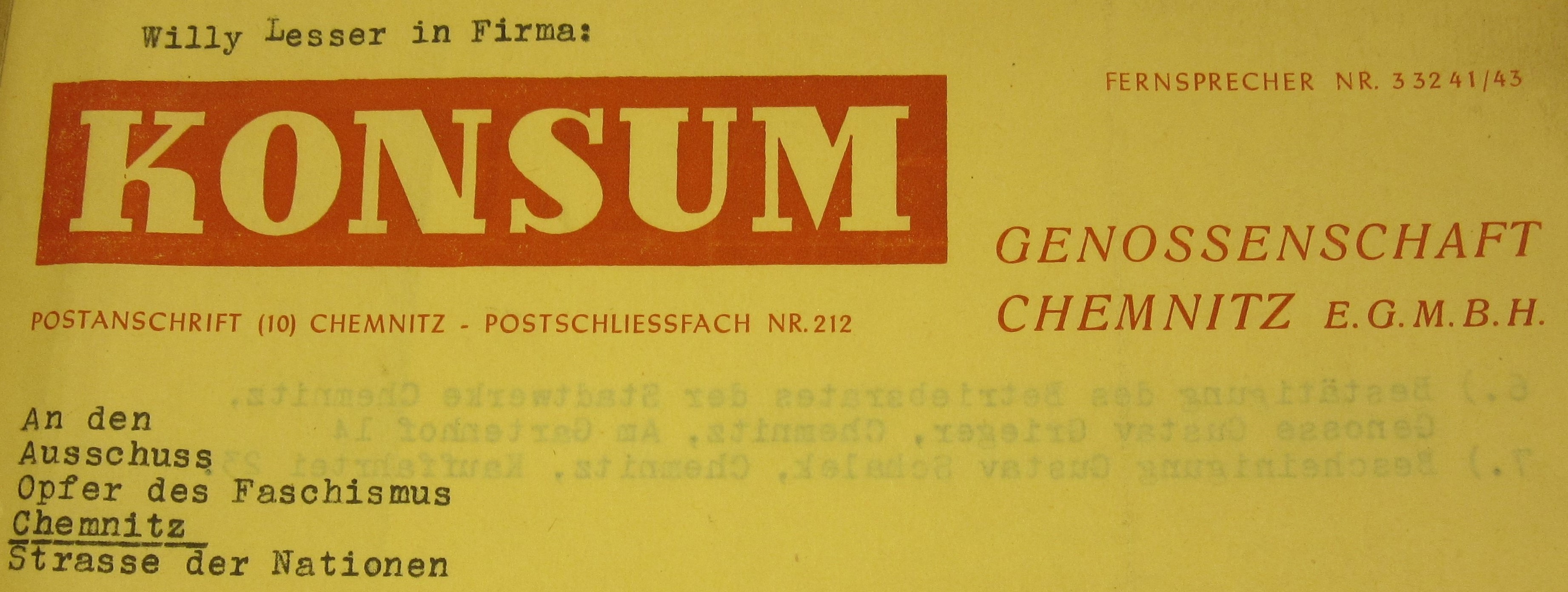 Im Mai 1945 wurde Willy Lesser von der sowjetischen Besatzungsmacht mit der Wiedererrichtung der Konsum-Genossenschaft (KG) in Chemnitz beauftragt. Er erhielt dazu alle erforderlichen Vollmachten, einschließlich eines Dienstwagens der Marke „Mercedes“. Der Betriebsausschuss der Gemeinschaftswerk-Versorgungsring Chemnitz GmbH bescheinigte ihm am 26. Juni 1945, dass er fortan als „Geschäftsführer“ beschäftigt war. Die Eheleute wohnten nunmehr auf dem Gelände Kauffahrtei 23.
