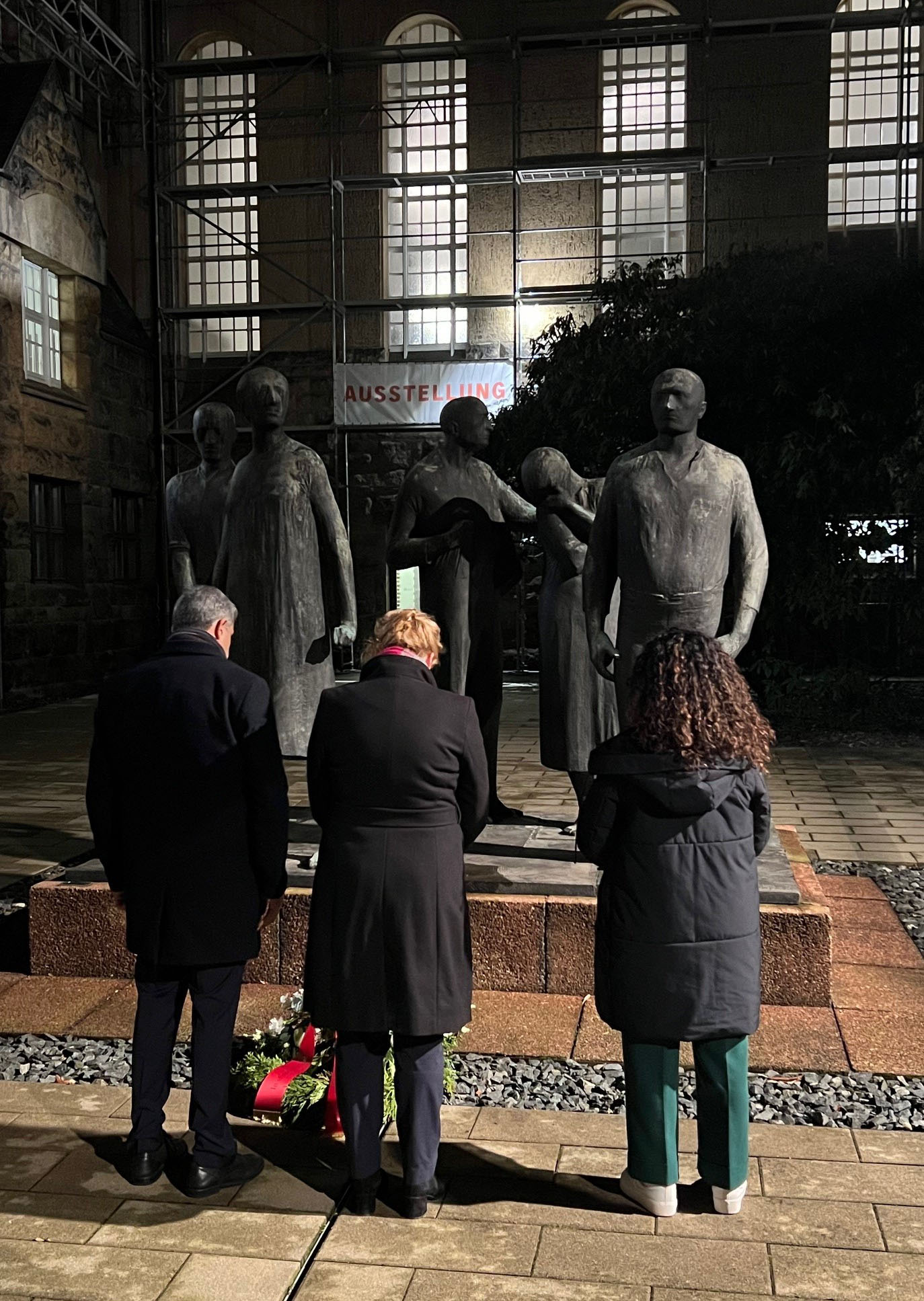 Zum Abschluss ihres zweistündigen Besuchs legten der Berliner SPD-Fraktionsvorsitzende Raed Saleh, die Wirtschaftssenatorin und Bürgermeisterin Franziska Giffey sowie die Arbeits- und Sozialsenatorin Cansel Kiziltepe im früheren Hinrichtungshof einen Kranz zum Gedenken an die Opfer nieder. In der Hinrichtungsstätte am Münchner Platz waren zwischen 1933 und 1945 insgesamt 1300 Menschen hingerichtet worden. Die weitaus größte Gruppe waren Tschechinnen und Tschechen, die Widerstand gegen die deutsche Besatzungsherrschaft geleistet hatten.