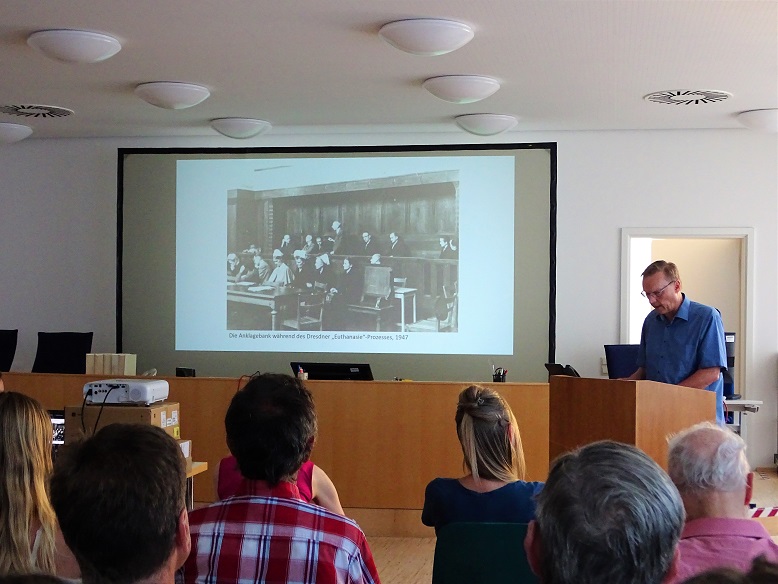 Der Leiter der Gedenkstätte Pirna-Sonnenstein, Boris Böhm gab im Folgenden einen Überblick zum Dresdner „Euthanasie“-Prozess. Mit 15 Angeklagten war es das größte ostdeutsche Verfahren gegen Beteiligte der nationalsozialisitischen Krankenmorde. In seinem Urteil kennzeichnete das Gericht die Krankenmorde deutlich als ein spezifisch nationalsozialistisches Verbrechen. Es widersprach damit Auslegungen der „Euthanasie“ als Sterbehilfe oder Erlösung vermeintlich leidender Menschen. Noch immer sind die in den Ermittlungen zusammengetragenen Erkenntnisse unverzichtbar für die historische Forschung zu den „Euthanasie“-Verbrechen in Sachsen.
